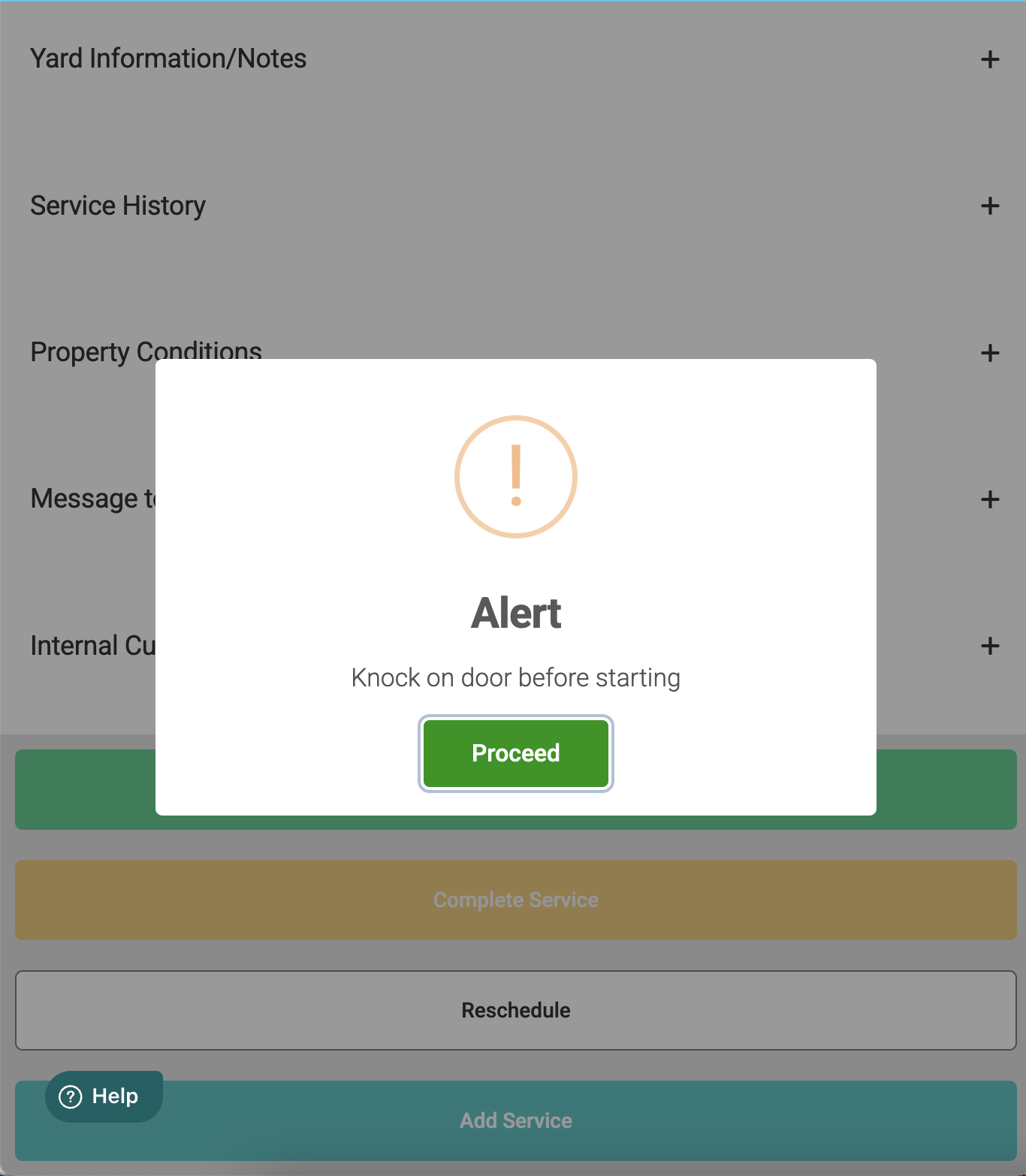 - If an alert was set up to show on the technician screen when initially created, then that alert will be displayed for the technician when they are completing a service at that property or for that customer. It will display as seen below after they click the "Start Service" button at the stop. You will also be able to see a "tech visible" tag on the Customer Quick View screen next to the alert.